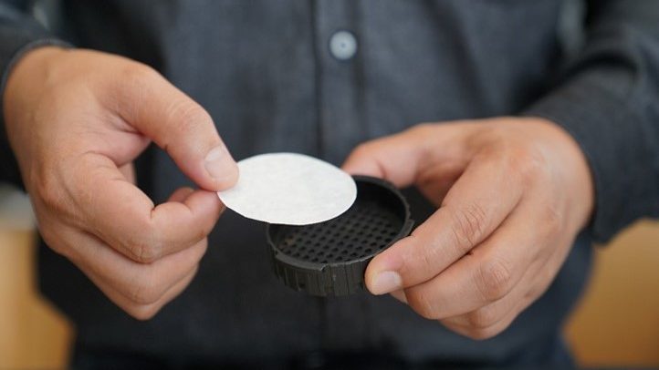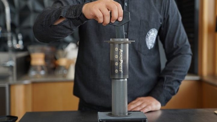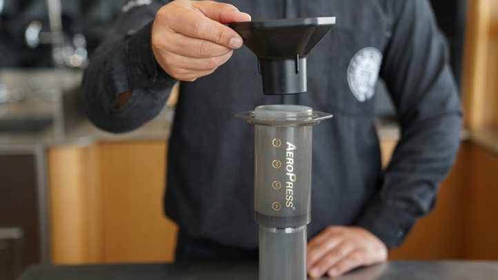 Insert a paper filter into the AeroPress’s detachable plastic cap.