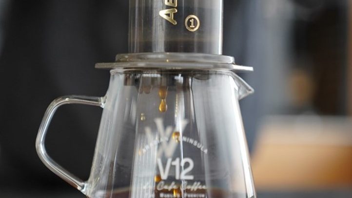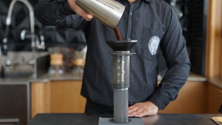 Position it on top of your brew vessel and begin applying downward pressure. You will experience about 30 pounds of resistance here. If the pushing feels too easy, your grind is likely too coarse; if it’s very hard to push, chances are the grind is too fine. Your coffee is fully brewed once it begins to make a hissing sound. This means there is no more water to push through the device.