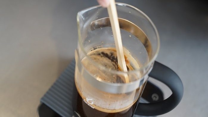 Gently remove your French press from the scale and place it on your counter. Press the filter down. If it’s hard to press, that means your grind is too fine; if the plunger “thunks” immediately down to the floor, it means your grind is too coarse. Adjust your grind size.